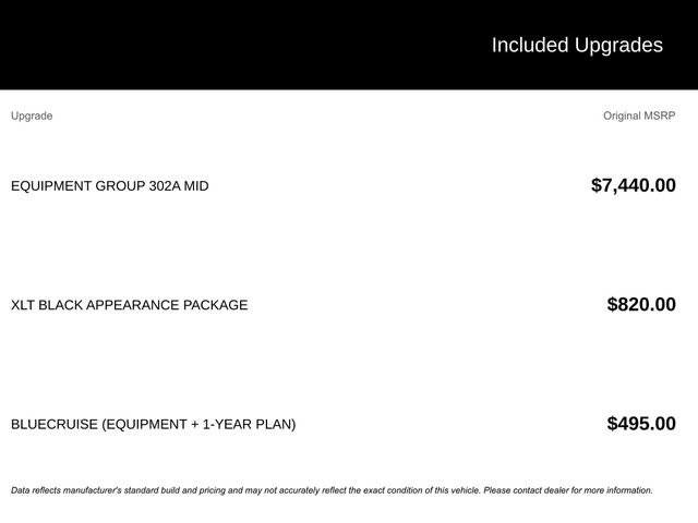 Price includes dealer added accessories. In addition, every vehicle comes with Ford Surface Protection, Nitro, Window Tint and Vin Etch at $1,397. See dealer for details. Price does not include Tax, Title, License or $425 Doc Fee. Customers may qualify for additional offers. See dealer for details. Price includes: Price does not include Tax, Title, License or $425 Doc Fee. Customers may qualify for additional offers. See dealer for details. Price includes: $1250 - Retail Bonus Cash. Exp. 01/05/2026 $2000 - Retail Bonus Cash. Exp. 01/05/2026